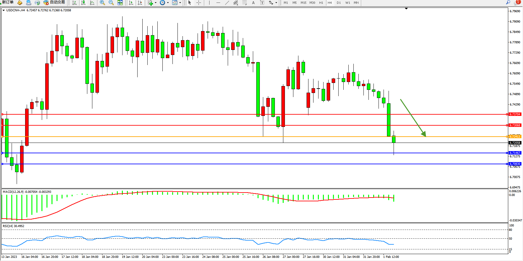 美元人民币USDCNH——4小时K线图显示: