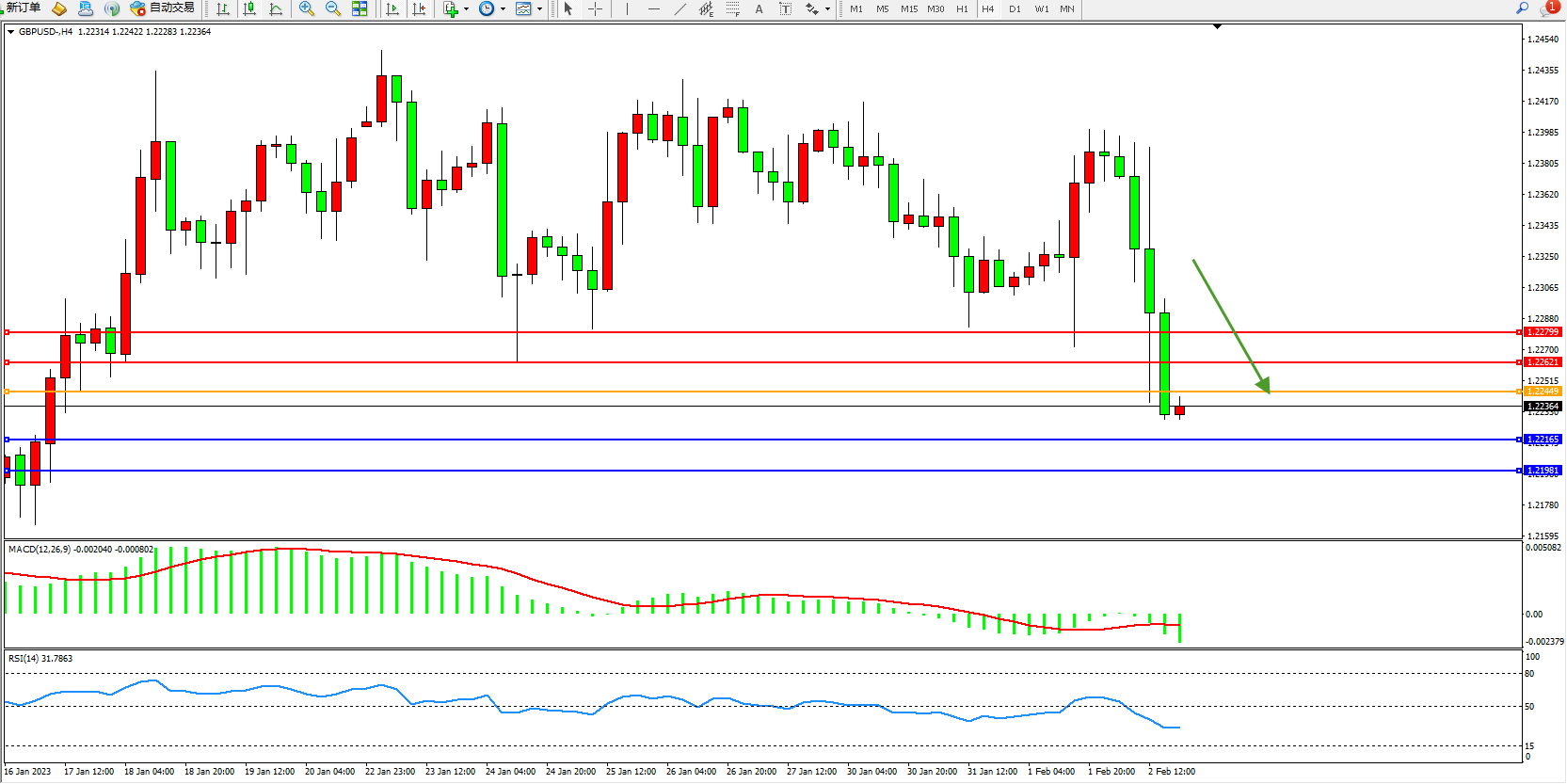交易策略:1.22449下方看跌,目标1.22165、1.21981