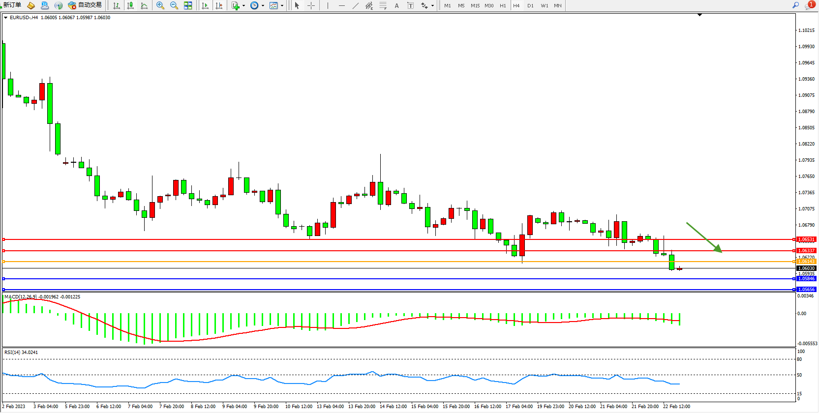 交易策略:1.06143下方看跌,目标1.05846、1.05656