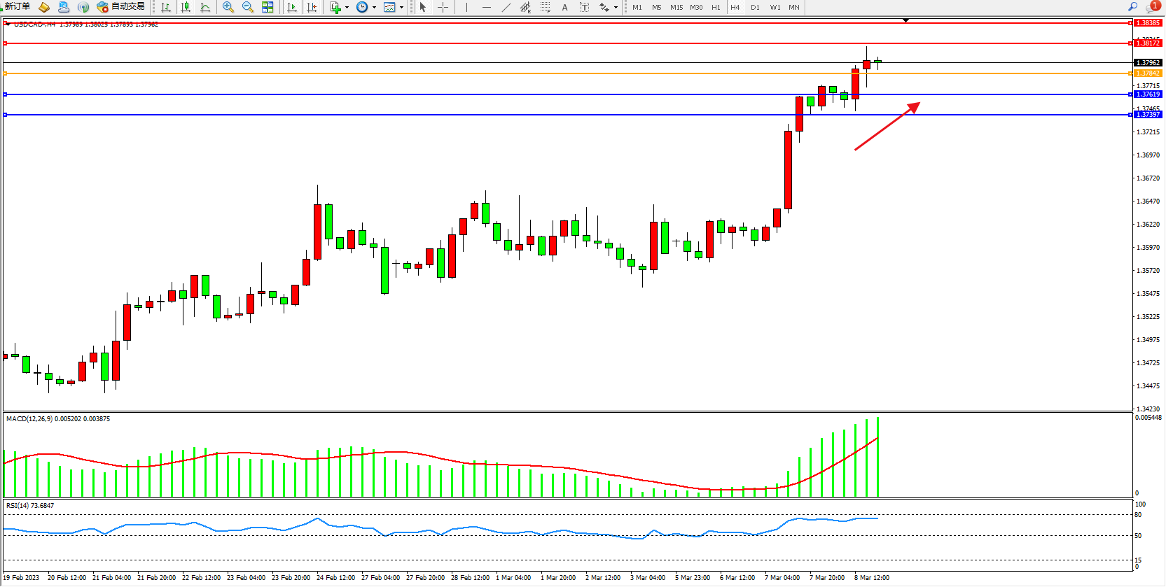 美元加元USDCAD——4小时K线图显示: