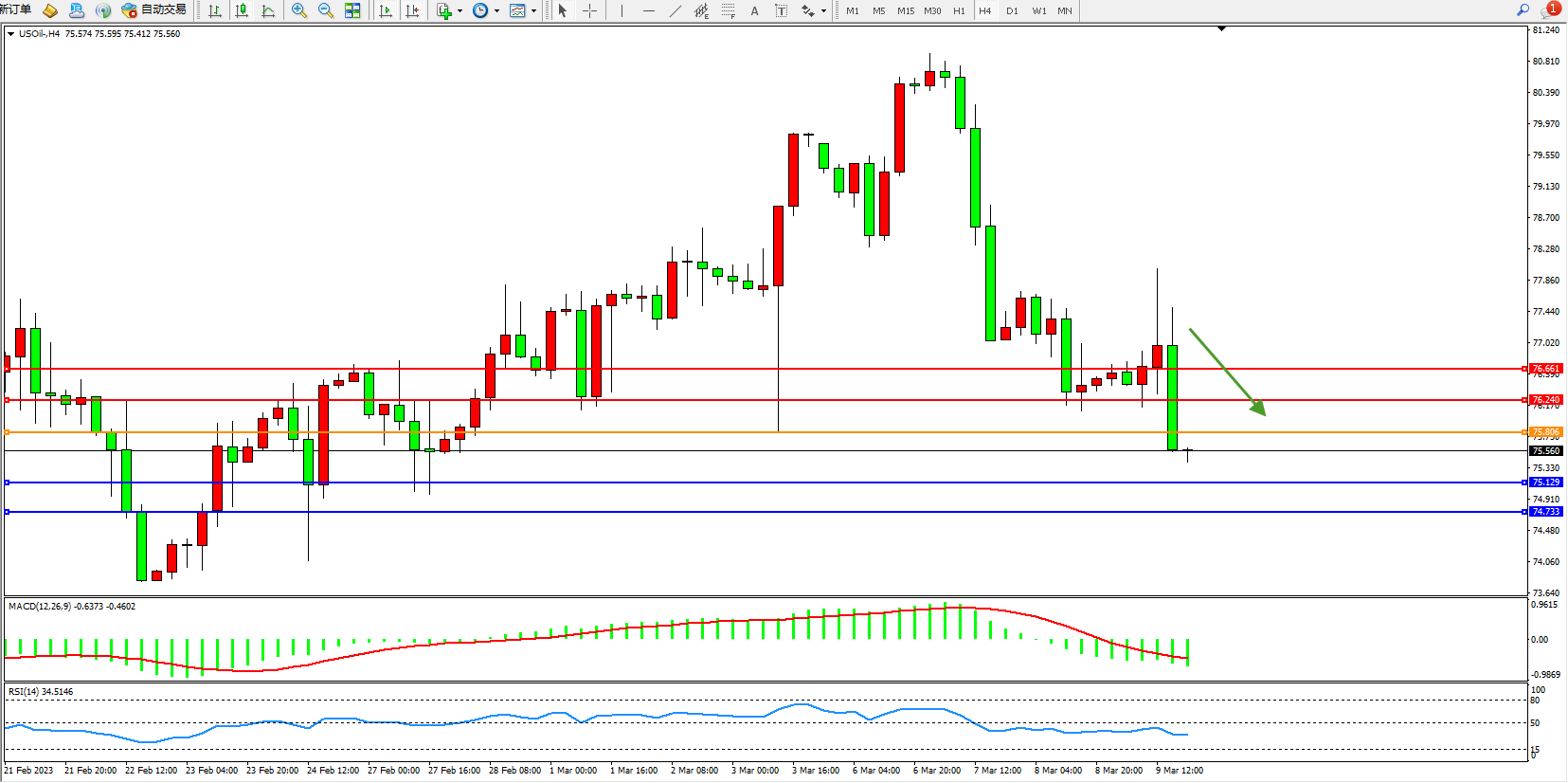 交易策略:75.806下方看跌,目标75.129 74.733
