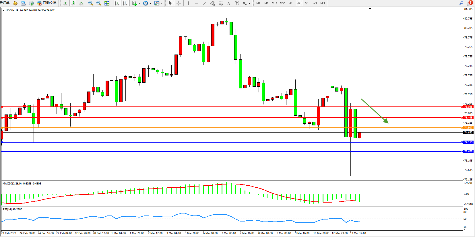 交易策略:74.907下方看跌,目标74.119 73.625