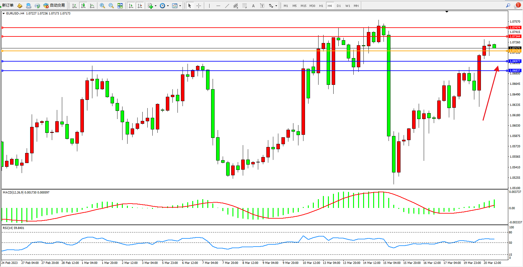 欧元美元EURUSD—4小时K线图显示: