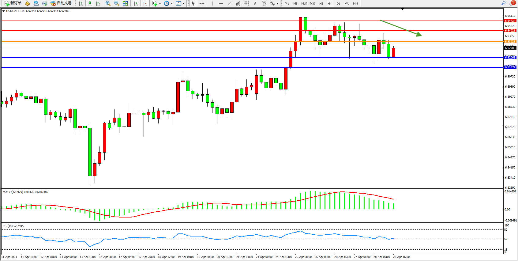 美元人民币USDCNH——4小时K线图显示: