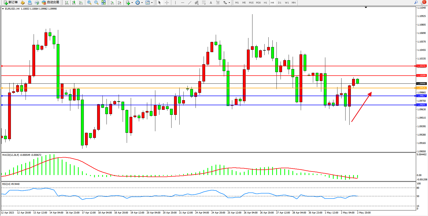 4小时图看:多头动力维持震荡上扬,短期看涨情绪涌现,市场多头动力不断拉升中,MACD指标处于0轴线下侧徘徊,RSI指标处于50均衡线附近徘徊;