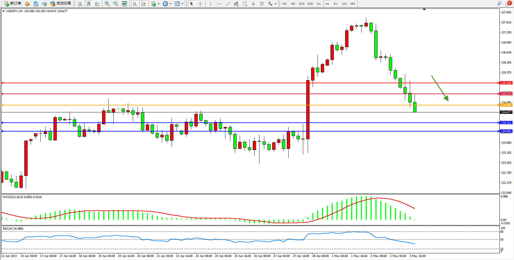 交易策略:134.906下方看跌,目标134.331  134.053