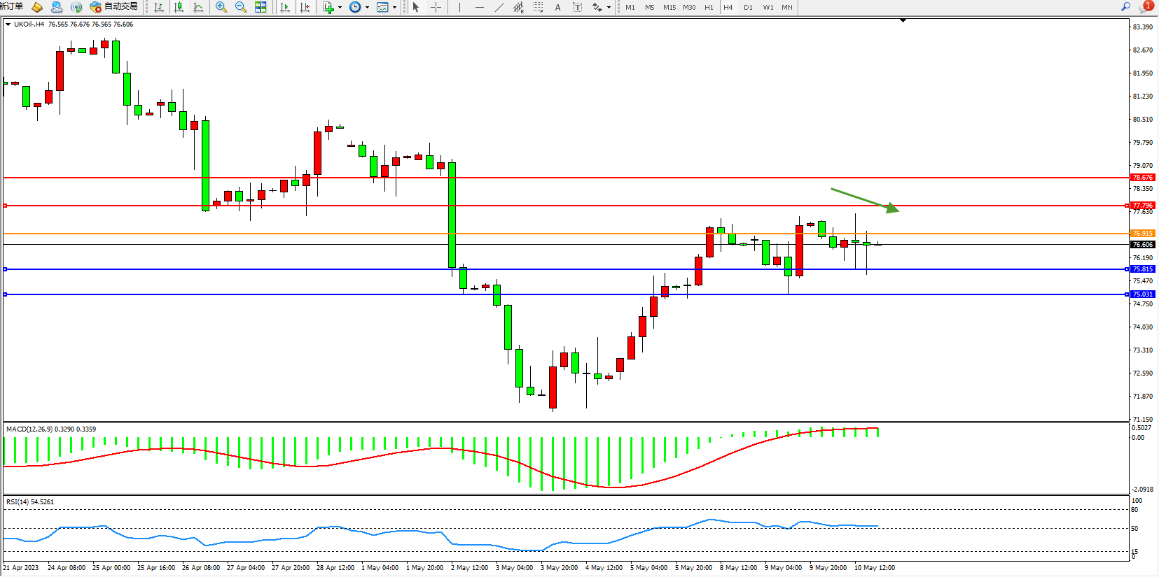 交易策略:76.915下方看跌,目标75.815 75.031