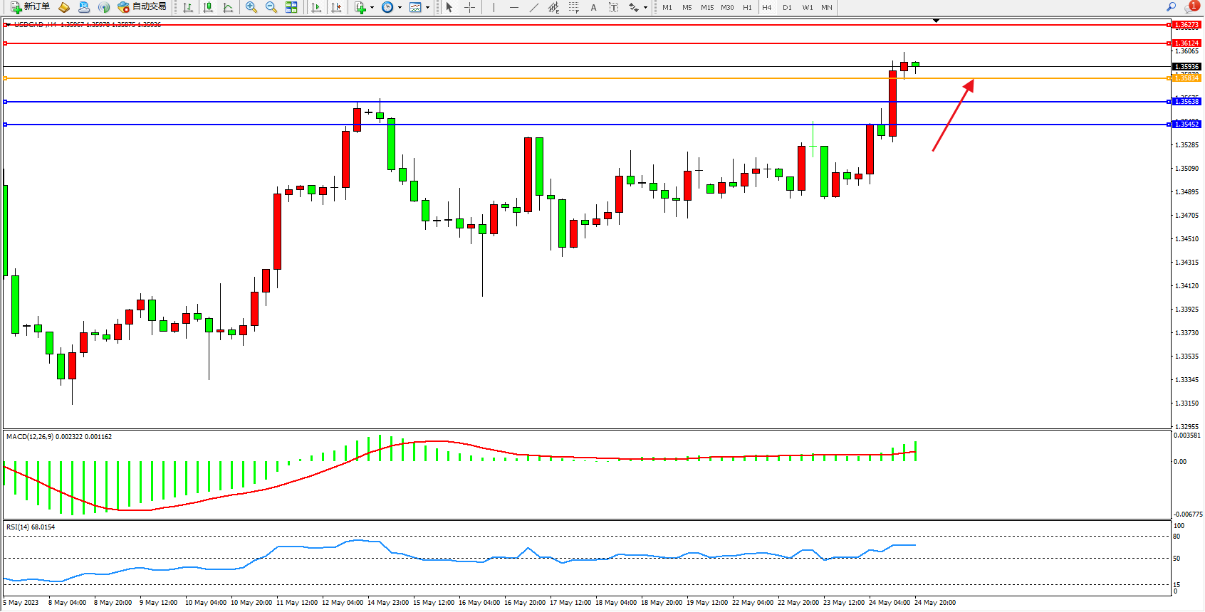 美元加元USDCAD——4小时K线图显示:
