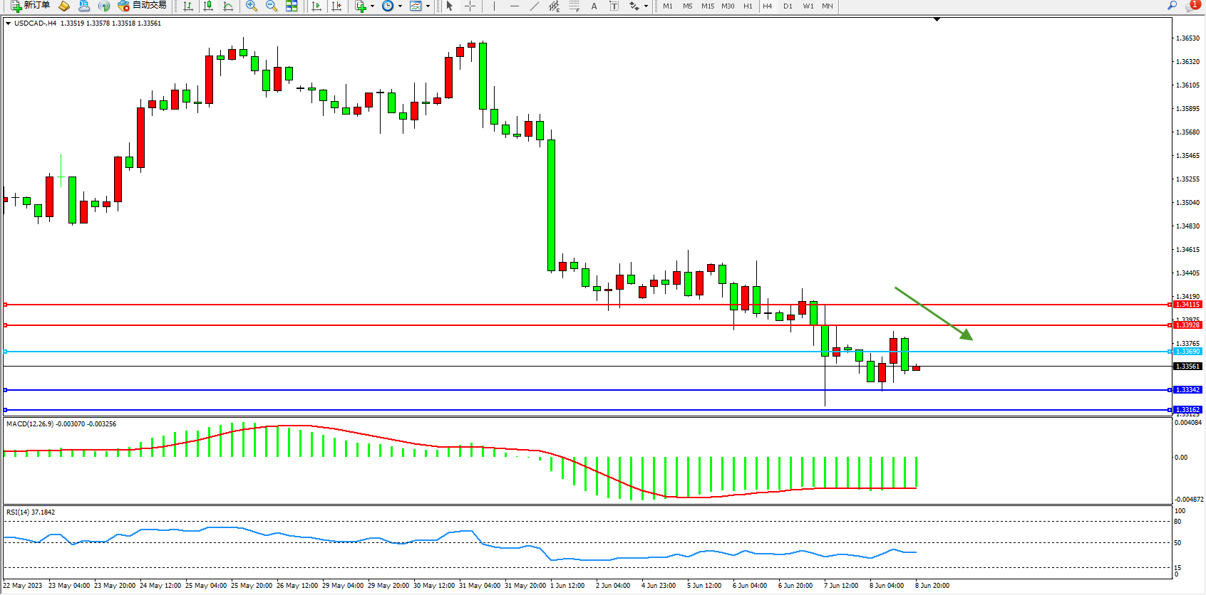 美元加元USDCAD——4小时K线图显示: