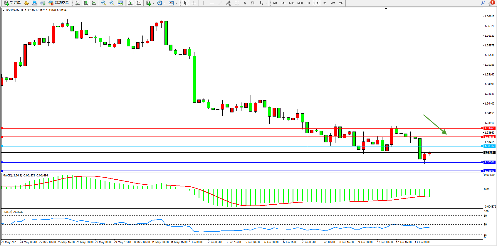 美元加元USDCAD——4小时K线图显示: