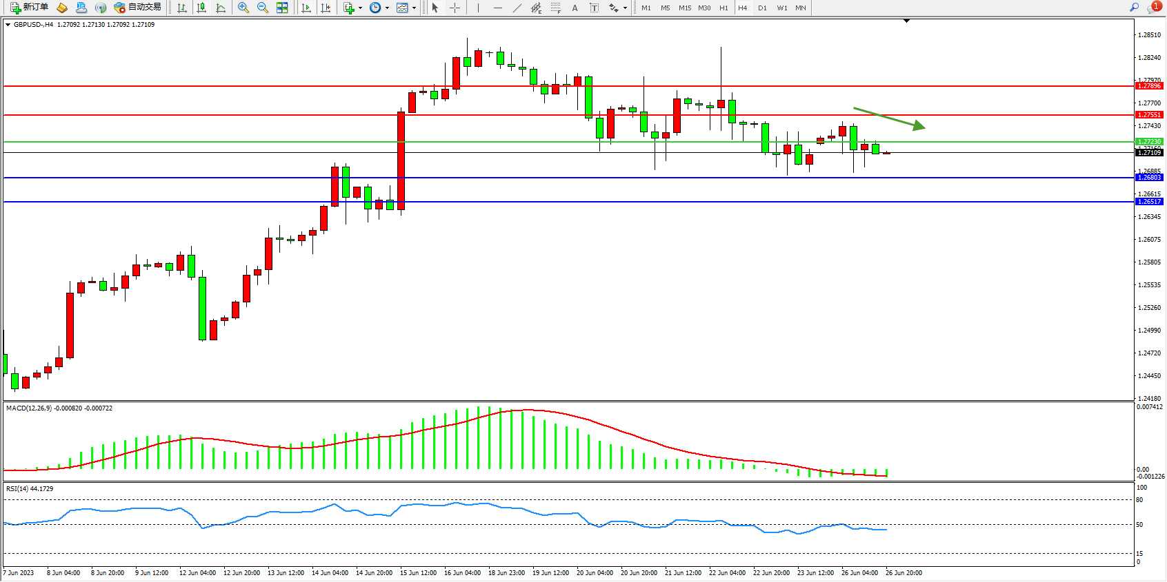 交易策略:1.27230下方看跌,目标1.26803 1.26517