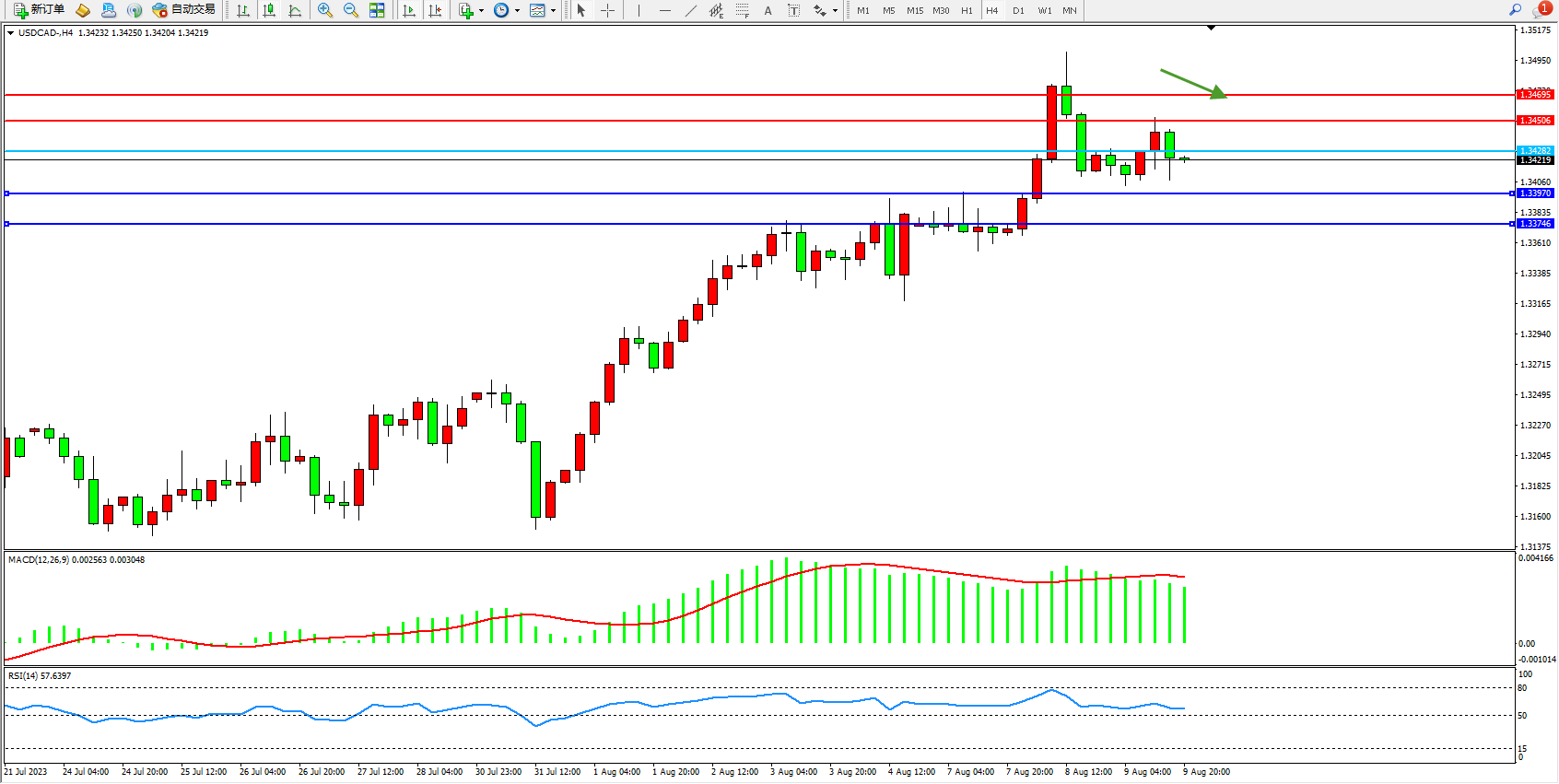 美元加元USDCAD——4小时K线图显示: