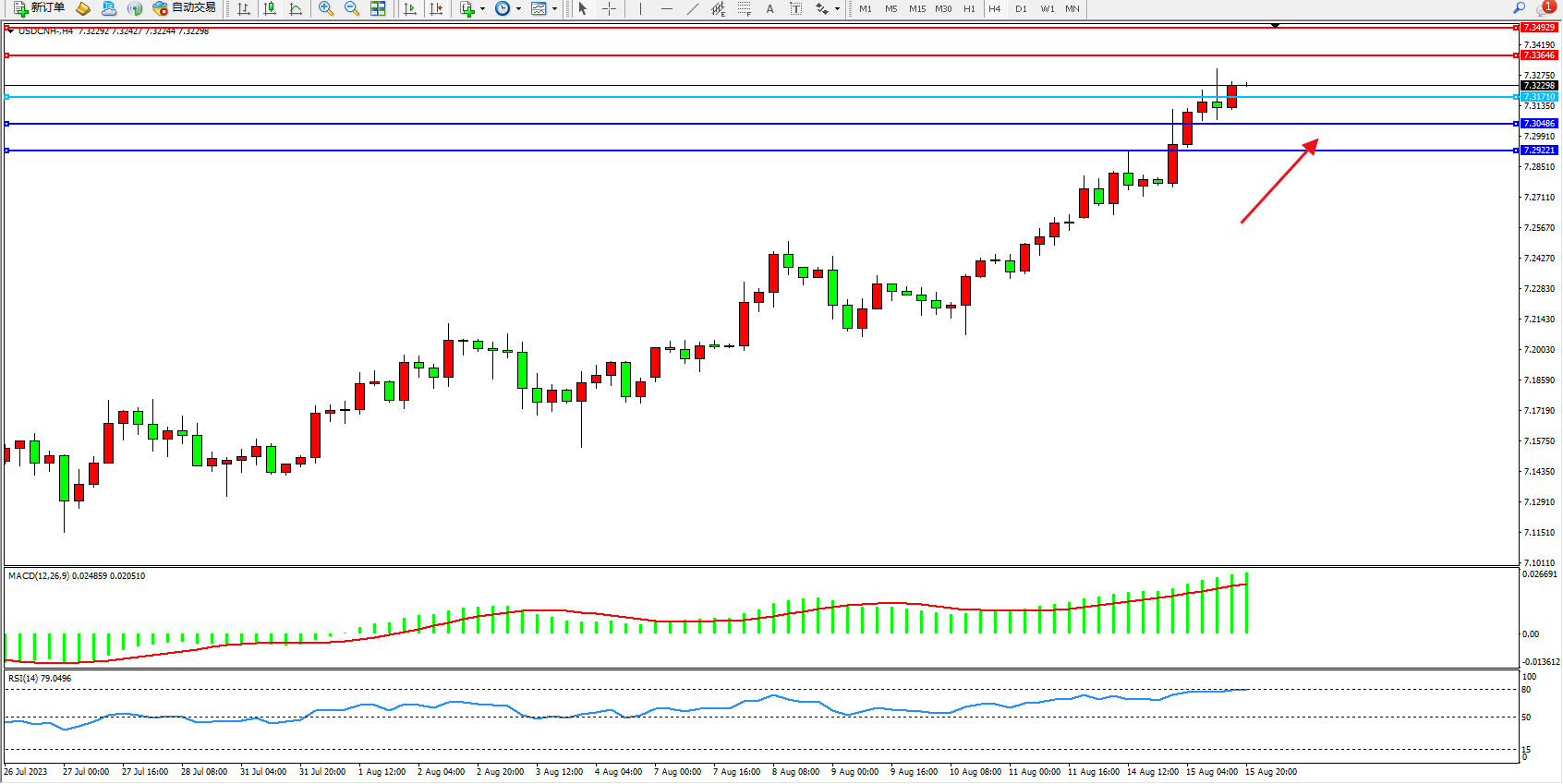 美元人民币USDCNH——4小时K线图显示: