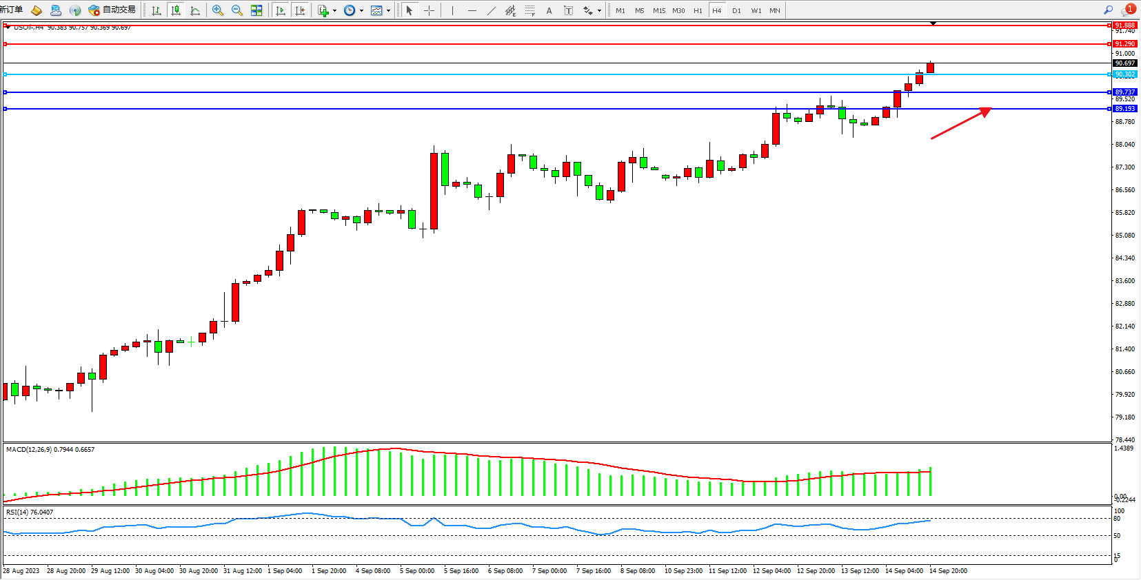 原油维持90.697附近震荡,原油市场已经采取了看涨立场并保持了上涨的轨迹。市场似乎已准备好瞄准90美元的水平,这表明市场明显试图突破近期的盘整格局。这种看涨情景的关键因素是供应短缺,这主要是由俄罗斯和沙特实施的自愿减产推动的。