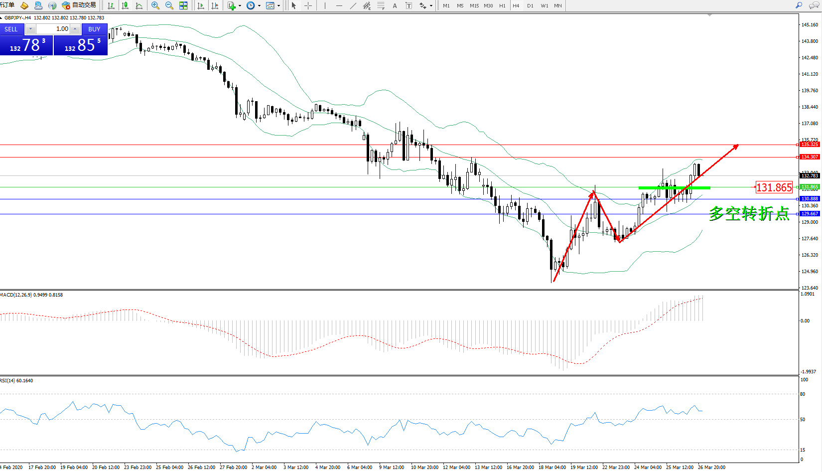 交易策略:131.865上方看涨,目标134.307、135.325