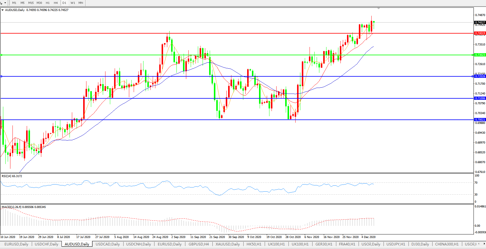 令人振奋的疫苗研发进展激励投资人转战风险较高资产,全球股市涨至纪录高点。Metals Focus的南亚资深研究顾问Harshal Barot表示“全球市场在疫苗推动的乐观情绪与美国财政刺激憧憬之间摇摆...因此冒险人气是正面的”。欧洲时段,澳元兑美元走高,创2018年7月以来近两年半新高,现报0.7475,涨幅0.86%,因全球风险偏好情绪进一步转暖,大宗商品价格走强,同时美元指数也继续表现疲软。澳元兑美元汇价因而在后市进一步上看0.75关键心理目标阻力位,而只要不跌破本周一的低点0.7373,强势上行的趋势就仍将维持。