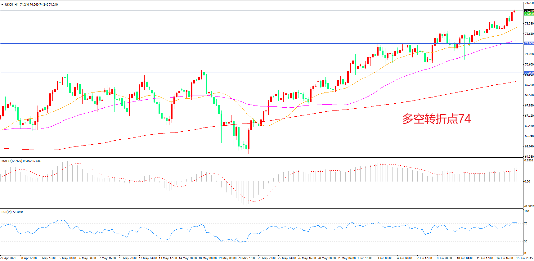 4小时图看,油价连续拉升,多头趋势十分明显,74美元成为短期多空分水岭,MACD红柱增加,均线系统呈多头排列,日内延续上行概率较大。