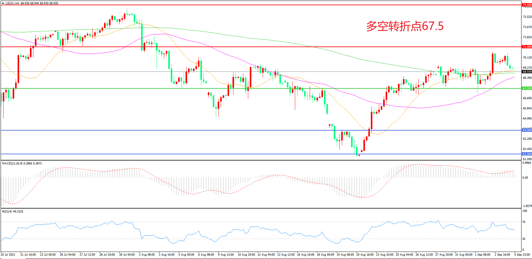 交易策略:在67.50之上看涨,目标71.00 74.50