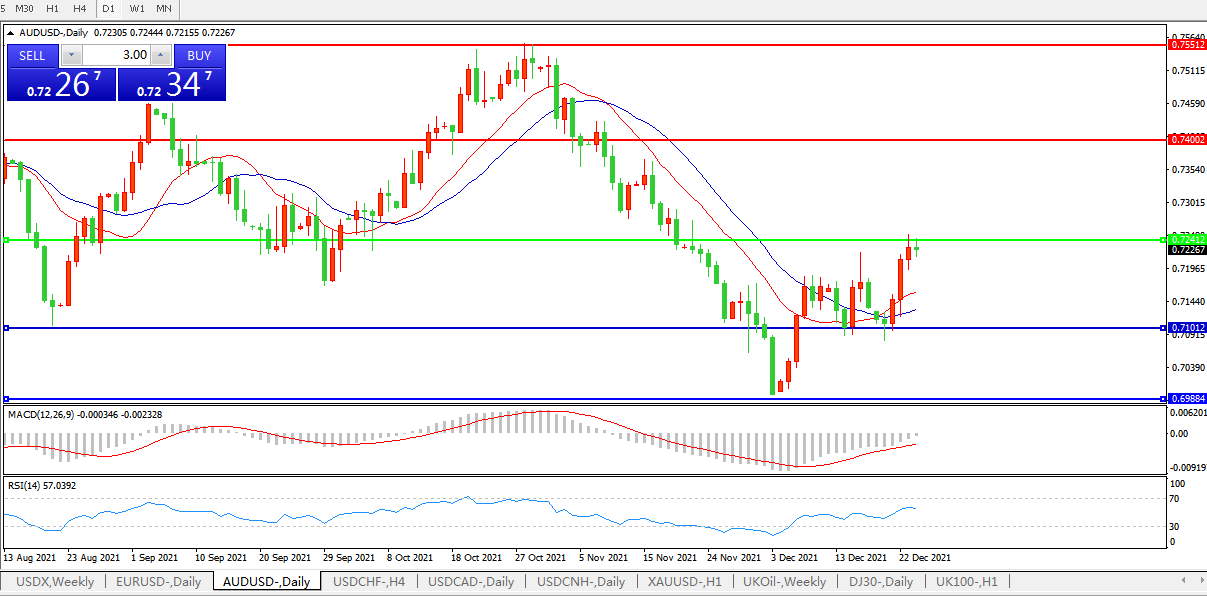 周五(12月24日)前半日澳元兑美元依然处于守势,目前徘徊于0.7230区域附近,因圣诞节前交易清淡,主要货币普遍窄幅波动。