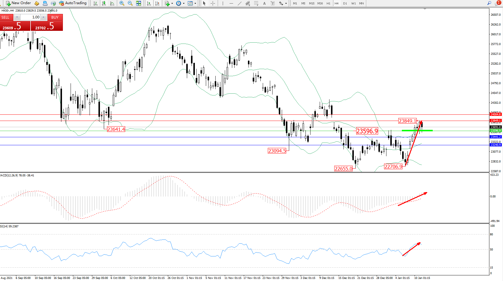 技术点评:低位多头动力强势拉升上扬,高位抵达23849位置后有继续攀升态势,布林带指标呈收口走势后开始逐渐张口,多头动力持续向上移动,MACD指标指标维持震荡上移至0轴线上方徘徊,RSI指标处于50均衡线上方多头区域震荡中;