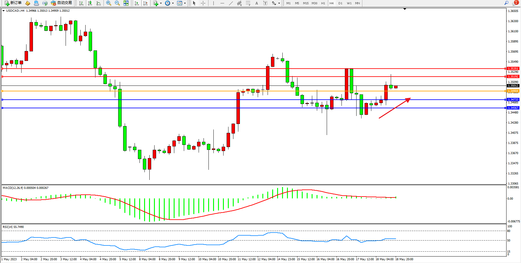 美元加元USDCAD——4小时K线图显示: