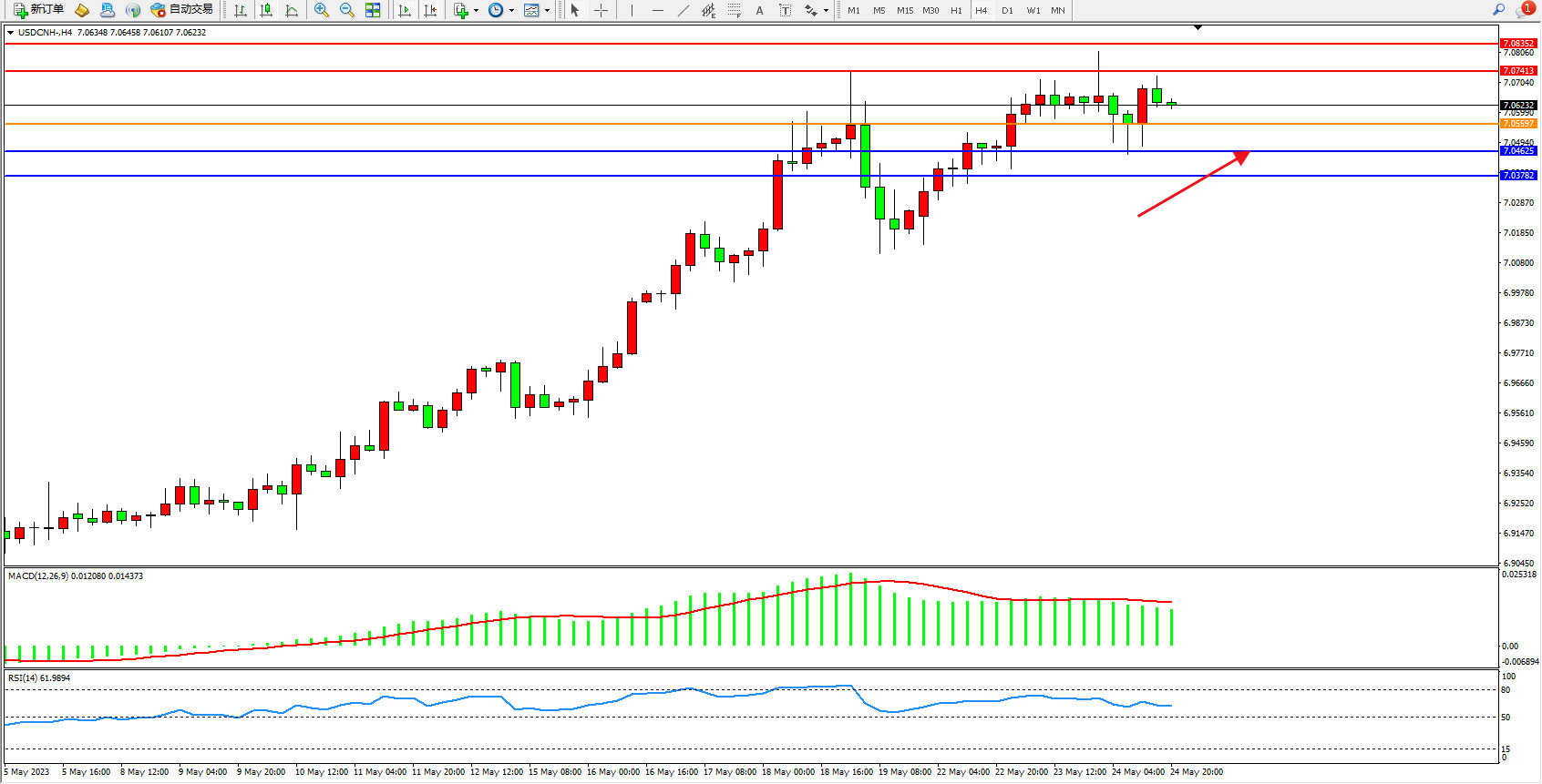 美元人民币USDCNH——4小时K线图显示: