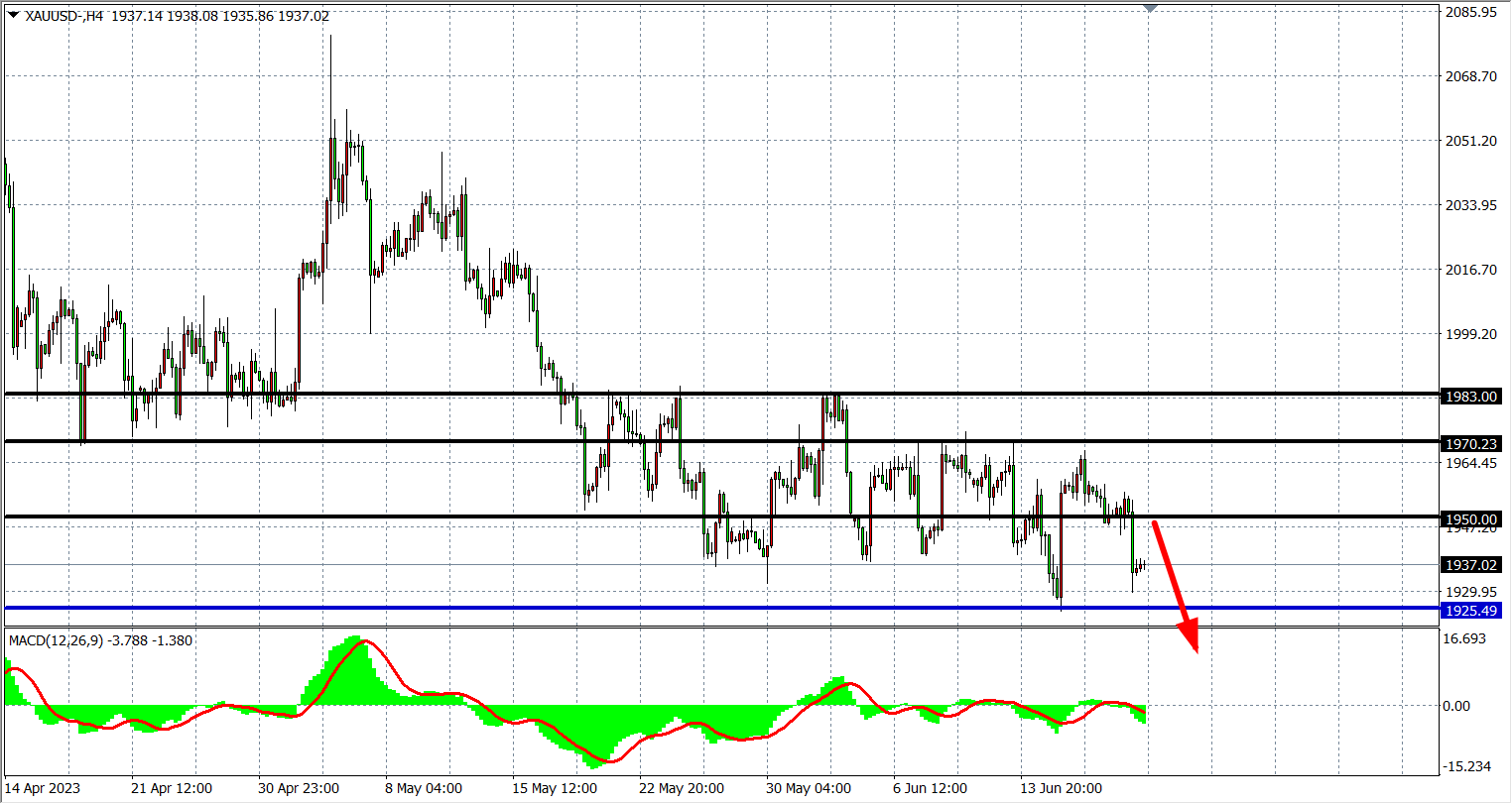 4小时图看,黄金在1970下进一步回调,MACD量能在零轴之下急速放量,空头走势偏强,支撑关注1925,阻力关注1950附近。